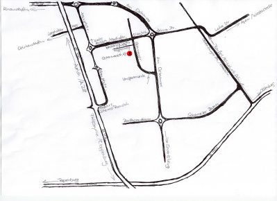 der Praxis liegt direkt hinter dem Baum nach der Laterne.